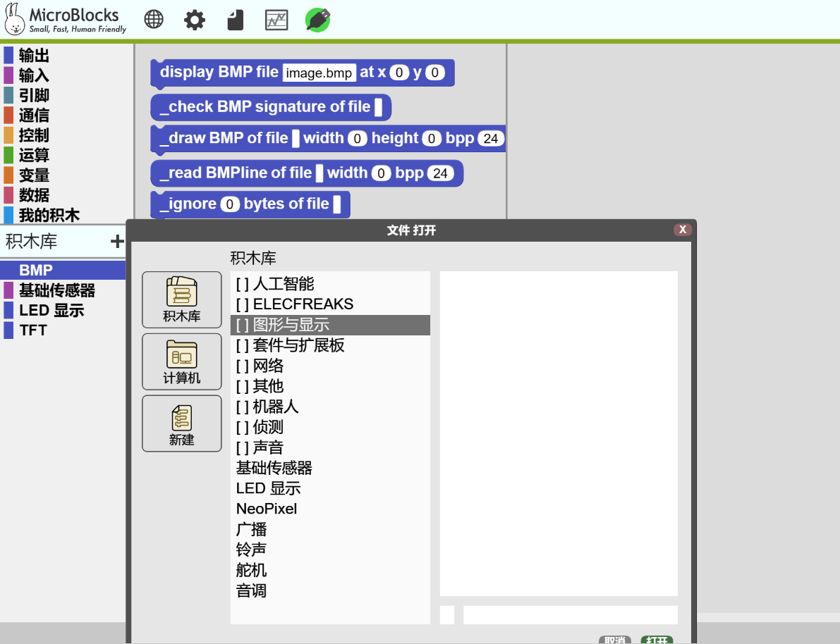 - BMP(上级目录:图形与显示):display BMP file 积木用于显示图形用户界面的标题位图。