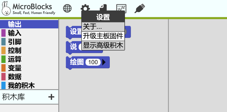 点击“设置”按钮,在弹出的下拉菜单内选择“显示高级积木”。