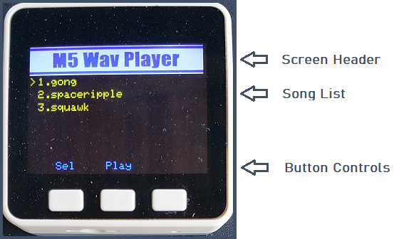 Up to six WAV files can be displayed on the screen. The user will select a file using the Sel butten then press Play to play it.
