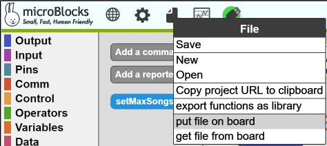 You will probably want to upload some WAV files of your own. Make sure that they are uncompressed WAV files (also called "Linear PCM"). The MicroBlocks WAV library can play uncompressed 8-bit or 16-bit, mono or stereo WAV files. However, since the ESP32 has only a single, 8-bit output channel, there's no benefit to using 16-bit or stereo WAV files; they don't improve sound quality and they take longer to transfer to the board.